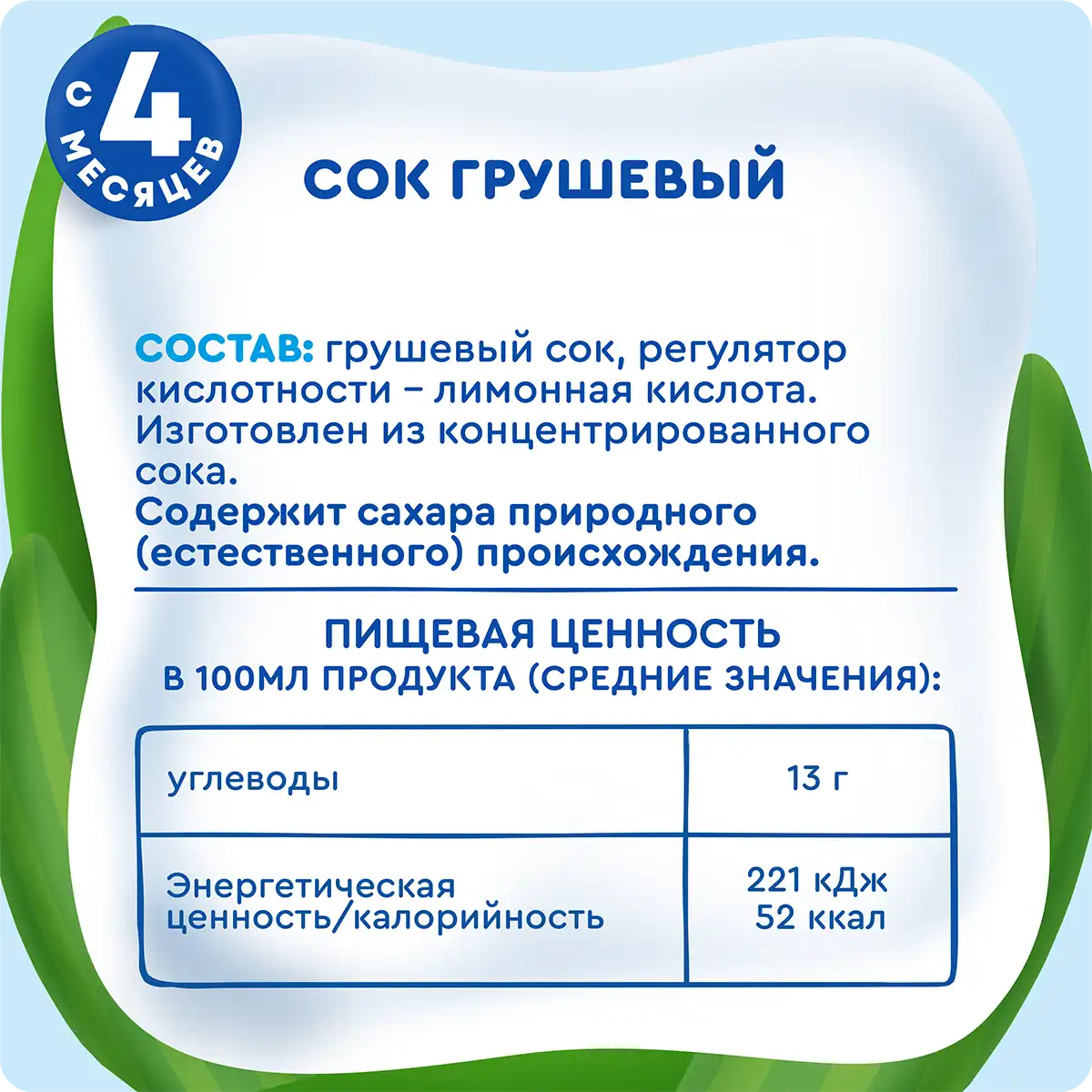 • Грушевый сок , регулятор кислотности – лимонная кислота . Изготовлен из концентрированного сока.